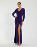 Stunning jersey gown featuring a cowl neck, long sleeves, ruched detailing, and a thigh high slit.