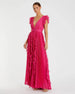 This elegant chiffon gown features a flattering v-neckline, playful ruffle cap sleeves, and gorgeous ruffle detailing throughout.