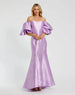 Crafted from elegant satin, this off-the-shoulder gown features puff sleeves and a sweeping train for a timeless silhouette.