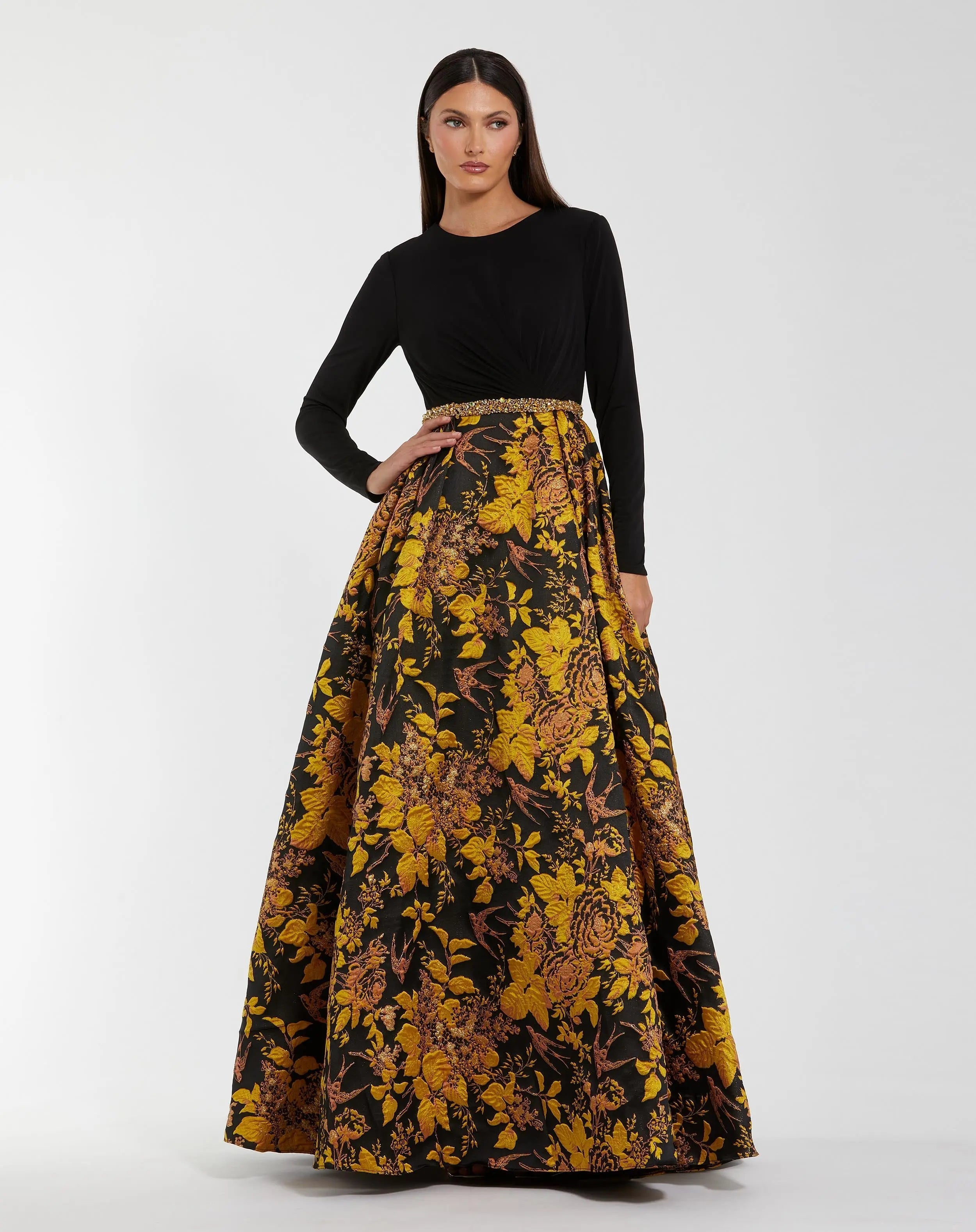 Black and Yellow Brocade Jersey Long Sleeve Ball Gown