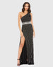 One-shoulder column gown detailed with rows of rhinestones, bejeweled waistline, and a thigh-high slit.